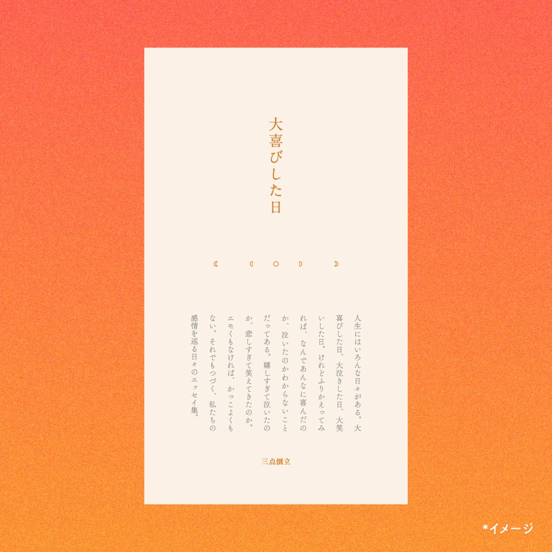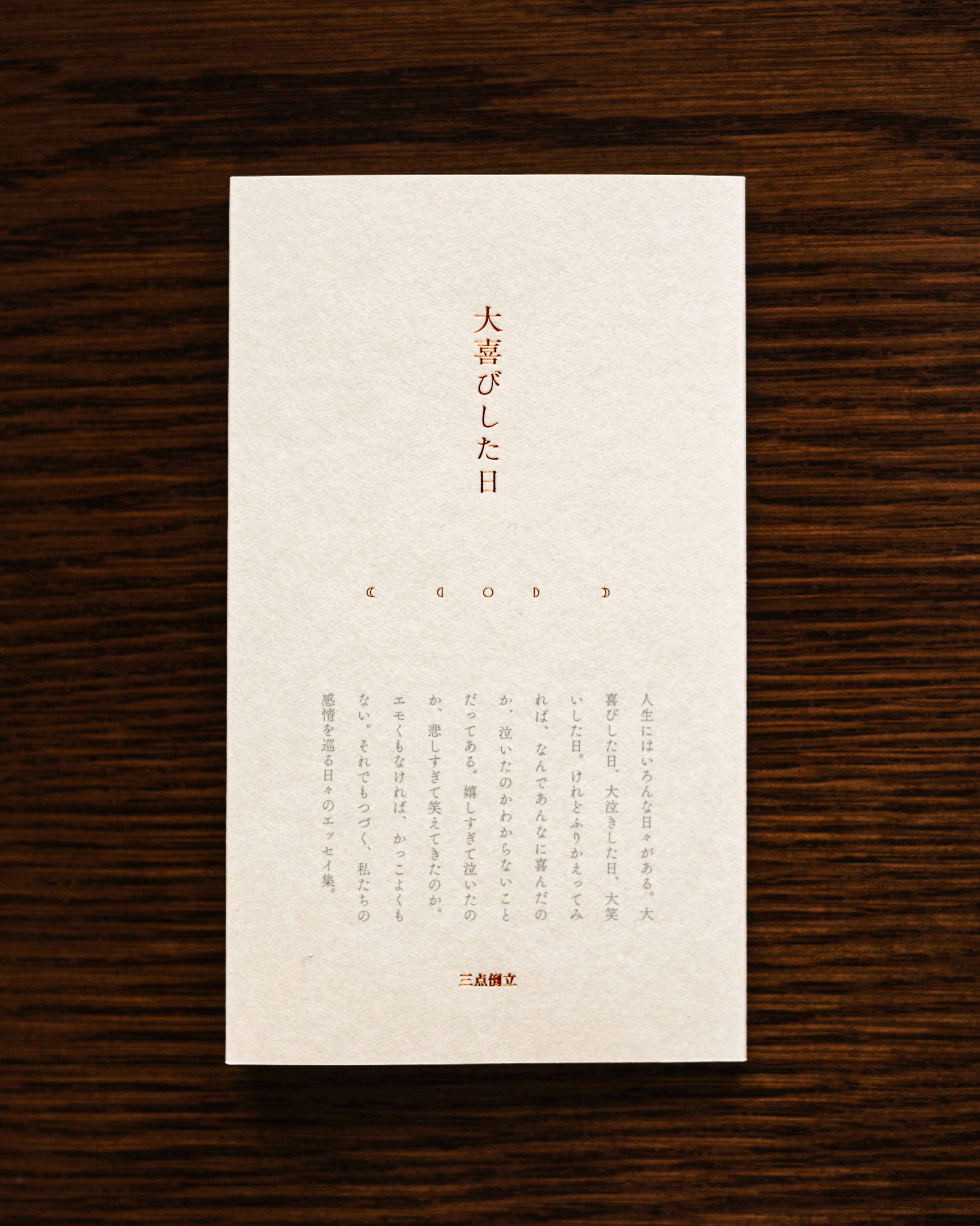 『大喜びした日』は編集とデザインのユニット・三点倒立の制作するリトルプレス。計12名の書き手が「大笑いした日」「大泣きした日」「大喜びした日」の3つのテーマに分かれて、大きく感情が揺さぶられた日のことを書いたエッセイ集です。合わせて3人の歌人が、テーマに沿った短歌を制作しました。